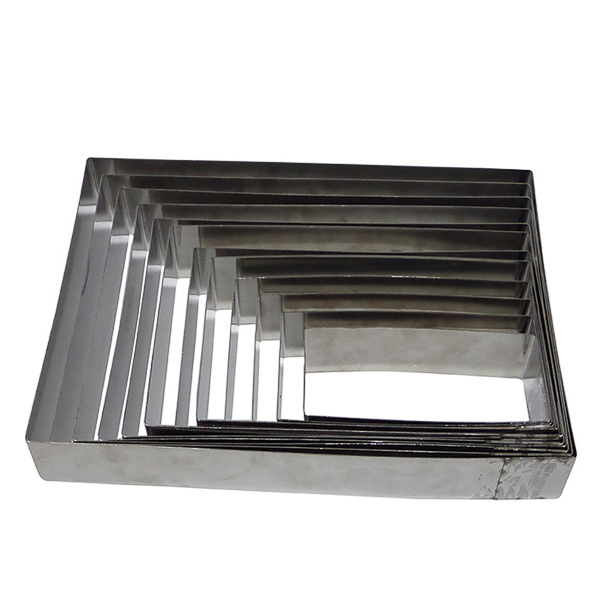 Aro de acero inoxidable con diseño rectangular, ideal para repostería, panadería y gastronomía. Facilita la elaboración de productos con cortes limpios y uniformes.
