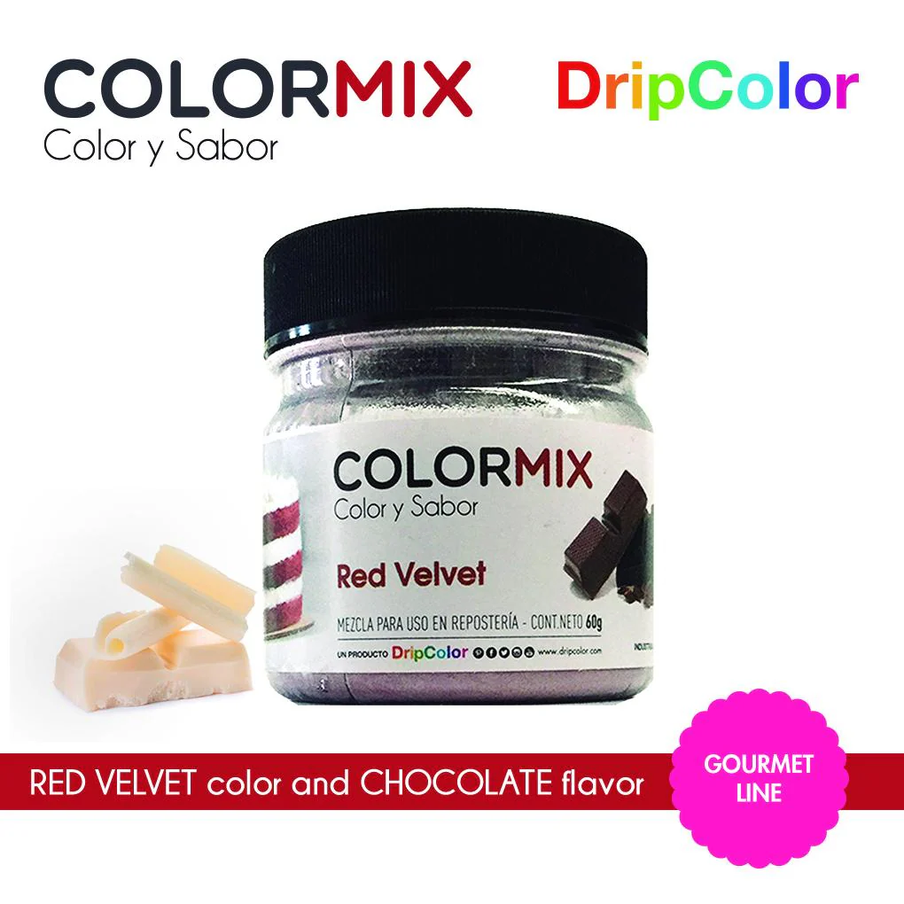 Colorante en polvo comestible ColorMix Red Velvet, aporta un intenso color rojo terciopelo y sabor a chocolate, ideal para realzar tus preparaciones de panadería y pastelería.