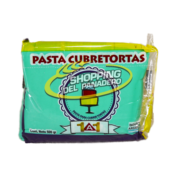 Pasta para cubrir tortas 1 a 1 en envase de 500 gramos.