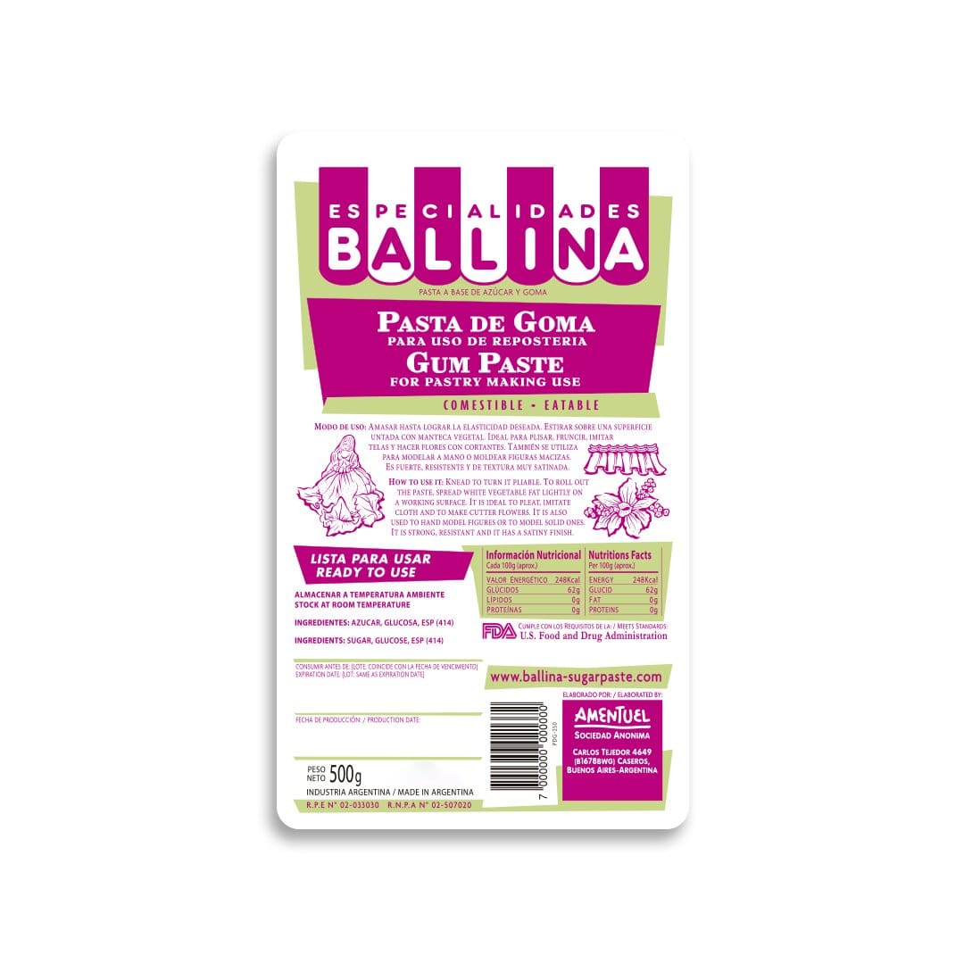 La Pasta Ballina Goma de 500 gr es perfecta para crear volados, telas y flores en repostería. Su alta elasticidad permite trabajar con detalles precisos y, al secar, adquiere la firmeza necesaria para mantener el acabado profesional de tus creaciones. Además, su sutil sabor a vainilla la hace versátil para diversas preparaciones.