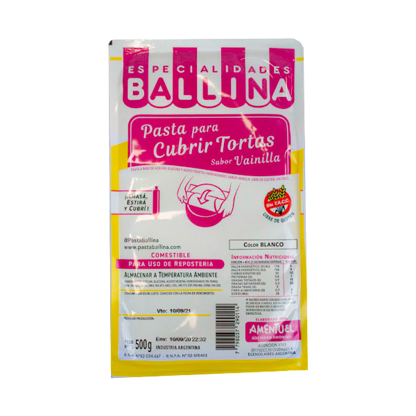 La Pasta Ballina Blanca con Sabor a Vainilla es una masa flexible y maleable, perfecta para cubrir y decorar tortas y pasteles. Su delicado sabor a vainilla complementa una amplia gama de postres, y su textura permite un acabado liso y profesional. Es fácil de manipular, lo que la hace ideal para crear figuras y detalles decorativos.