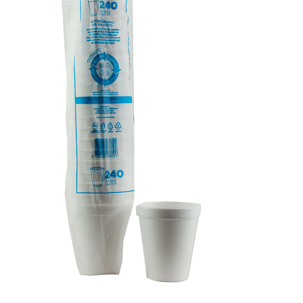 Vaso térmico de telgopor de 240 cc, pack de 25 unidades.